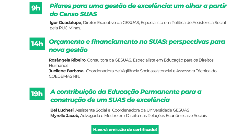 Teremos uma programação que vai te surpreender, com muito conteúdo e reflexões guiadas pelo tema central “Novos 04 anos de oportunidades para o fortalecimento do SUAS.”