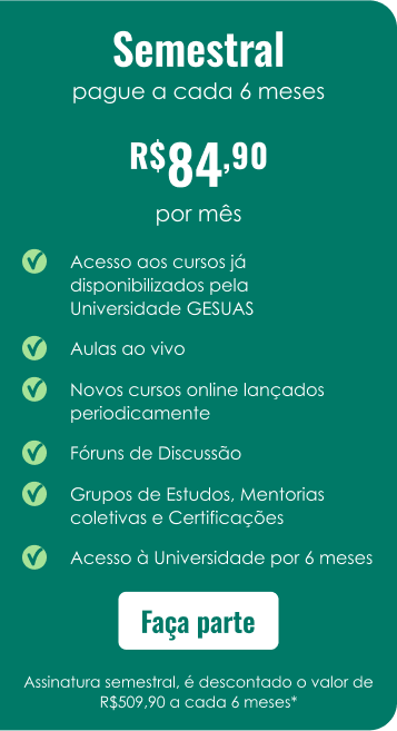 Você escolhe o plano que melhor atende às suas necessidades e faz a adesão clicando nos botões de matrícula disponíveis nesta página. Nesse sistema por assinatura, o pagamento é recorrente. Ou seja, se você fizer a assinatura mensal, semestral ou anual ela será renovada automaticamente após o período escolhido, caso você não realize o cancelamento prévio.